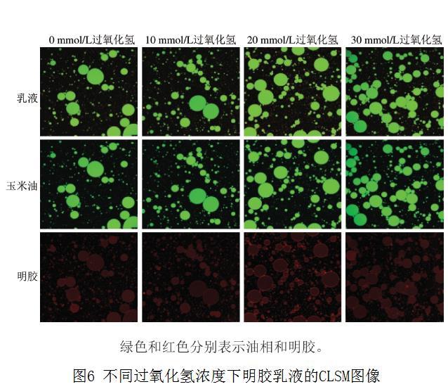 乳液通常是指將一相作為液滴分散在另一相中。如圖6所示,隨著過氧化氫濃度的增加,乳液的液滴尺寸減小,這可能與較少的蛋白質吸附到油-水界面層有關。據報道,EAI較高的蛋白質有利于吸附到油-水界面,減少油-水界面的界面張力并表現出更加小而密集的乳液液滴。本研究中明膠吸附率及界面張力的測定結果可以支持氧化明膠更容易吸附到油-水界面這一觀點。