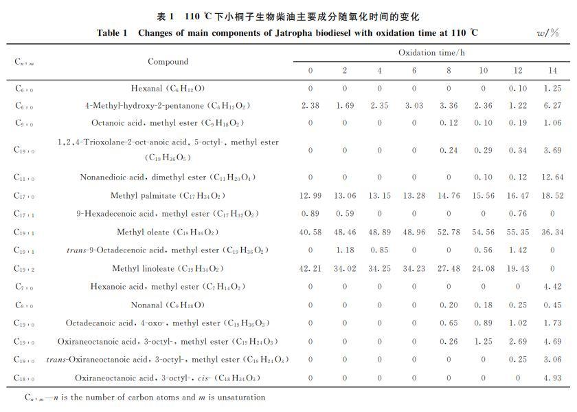 小桐子生物柴油氧化期間GC-MS組成分析結(jié)果見表1。由表1可知,小桐子生物柴油的主要成分是棕櫚酸甲酯、油酸甲酯、亞油酸甲酯,歸一化后的質(zhì)量分?jǐn)?shù)為95.78%。在氧化過程中,含有2個碳碳雙鍵的亞油酸甲酯的含量降低,氧化0h的小桐子生物柴油亞油酸甲酯(C19:2)質(zhì)量分?jǐn)?shù)為42.21%,加速氧化14h,質(zhì)量分?jǐn)?shù)為0,說明亞油酸甲酯幾乎完全氧化,這是因為多不飽和脂肪酸甲酯比單不飽和脂肪酸甲酯更容易氧化。與單不飽和脂肪酸相比,亞油酸甲酯的碳鏈含有更多的雙烯丙基位點,雙烯丙基質(zhì)子對氧自由基的攻擊敏感,導(dǎo)致分子發(fā)生氧化,從而形成過氧化合物,過氧化合物進(jìn)一步氧化轉(zhuǎn)化成醛、酮等化合物。