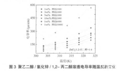 圖3聚乙二醇/氯化鋅/1,2-丙二醇溶液電導(dǎo)率隨溫度的變化