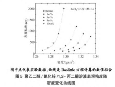 圖5聚乙二醇/氯化鋅/1,2-丙二醇溶液表觀粘度隨密度變化曲線圖
