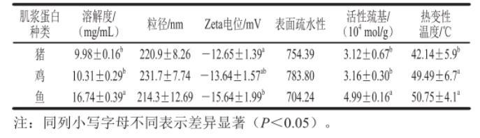 表面疏水性同時又與其他指標有著密不可分的關系,例如熱變性溫度,因為適當?shù)臒崽幚頃斐杉{蛋白內部疏水基團暴露在蛋白質表面,從而使蛋白質的表面疏水性增強,這樣就可以改善蛋白質的乳化活性和乳化穩(wěn)定性。3種肌漿蛋白熱變性溫度都較低,在40~55℃之間,其中魚肉肌漿蛋白變性溫度最高而豬肉肌漿蛋白最低,且豬肉肌漿蛋白熱變性溫度與雞肉和魚肉間差異顯著(P<0.05),而雞肉與魚肉肌漿蛋白間的變性溫度無顯著性差異。所以在肌漿蛋白的研究中,如何根據(jù)不同蛋白的變性溫度差異,準確控制熱處理的強度至關重要,本研究可給蛋白變性凝聚組裝類的研究提供基礎數(shù)據(jù)的參考。