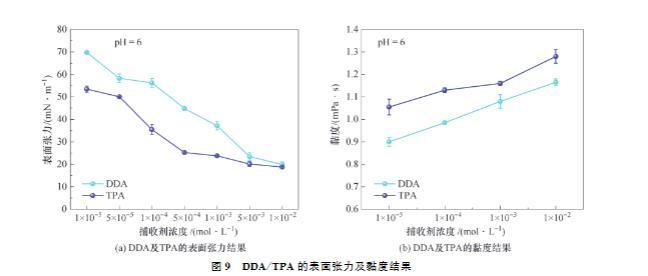 DDA及TPA的黏度結果如圖9(b)所示。由圖9(b)可知,弱酸性條件下,DDA或TPA的黏度均隨著捕收劑用量的增加而增大,這說明DDA或TPA均能增強溶液黏度。當捕收劑濃度一致時,TPA的黏度總是大于DDA,這說明較高黏度的TPA具有更穩定