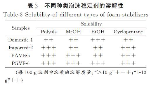 聚氨酯發(fā)泡過程中,各原料之間的相容性對泡沫的性能有重要影響。相容性好的原料可以確保發(fā)泡過程中的化學(xué)反應(yīng)順利且充分進(jìn)行,從而獲得均勻、細(xì)膩的泡沫結(jié)構(gòu),提高泡沫的物理性能和使用性能。表3是不同種類泡沫穩(wěn)定劑在不同溶劑中的溶解性測試,通過測試結(jié)果可知,經(jīng)過接枝改性后的PAVE-5和PGVF-6在多元醇和環(huán)戊烷中的溶解性較好,和國產(chǎn)-1、進(jìn)口-2等泡沫穩(wěn)定劑都能夠很好的溶解在多元醇和環(huán)戊烷中。PGVF-6和PAVE-5在多元醇中表現(xiàn)出的優(yōu)良溶解性主要得益于POSS接枝的APEG鏈段的醚鍵和羥基都具有明顯的極性,這使得其分子間以及與其他極性分子間可以形成較強(qiáng)的極性相互作用。這種相互作用有助于分子間的相容性,對聚氨酯泡沫的形成和性能有積極作用。