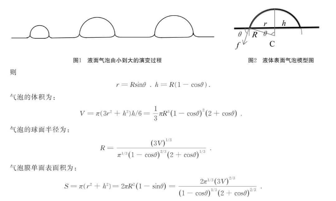 氣泡一般是由于氣體通過小孔浸人液體層后分散擴張形成的.在氣泡形成過程中,由于液體表面張力的作用,使液膜呈收縮趨勢.球形氣泡的液膜表面積最小,所以,在沒有其他因素影響的條件下,空中和液體中的氣泡應處于球形的亞穩(wěn)狀態(tài).當氣泡落在液體表面或由液體內部上升到液體表面以后,沒破裂的氣泡不再呈現(xiàn).球形狀態(tài),與液體表面直接形成的氣泡一樣,呈現(xiàn)球缺形狀.液面氣泡由小到大的演變過程如圖1所示.當氣泡足夠大時,液體表面氣泡實際形狀接近半球,但在氣泡與液體表面接觸處可觀察到氣泡內、外均存在液面向上彎曲現(xiàn)象,且泡內水平液面相比氣泡外水平液面位置出現(xiàn)微小凹陷.