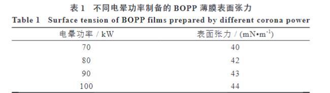 電暈功率的變化引起了BOPP薄膜表面化學組成的變化,會進一步導致BOPP薄膜表面張力的改變。為了考察電暈功率對BOPP薄膜表面張力的具體影響規律,測試了在47℃預熱溫度條件下用不同電暈功率制備的BOPP薄膜剛下線時的表面張力,結果見表1。