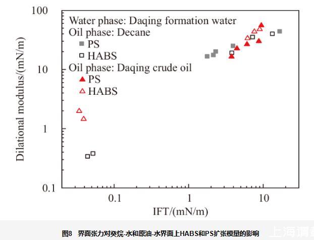 圖8界面張力對癸烷-水和原油-水界面上HABS和PS擴張模量的影響