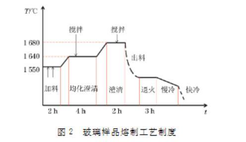 實驗樣品的熔制流程如圖2所示,首先根據組分設計計算玻璃配方,稱量并配制約500g配合料,在研缽內充分研磨、混合均勻,待硅鉬棒電爐升溫至1550 ℃時,將混合均勻的配合料分多次加入預熱過的鉑金坩堝中,保溫2h至原料熔化充分后以5 ℃/min的升溫速率加熱至1640 ℃,并在該溫度條件下保溫4h,實現玻璃的充分熔化與澄清。然后繼續升溫至1680 ℃保溫2h使玻璃液完全澄清,出料前30 min進行攪拌,然后將玻璃液澆筑在預熱的耐熱鋼模內,成型后轉入780 ℃的馬弗爐內進行退火處理,保溫3h后再以1 ℃/min降溫速率慢冷至300 ℃,隨爐冷卻得到經過退火的玻璃樣塊。