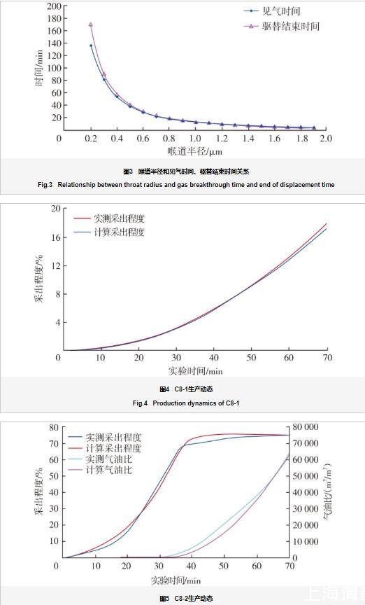 以時間為節(jié)點,運用節(jié)點分析法計算任一驅(qū)替時刻前緣位置以及見氣時間和驅(qū)替結(jié)束時間(圖3)。選擇時間步長為2 s,從驅(qū)替開始起算,在2 s的時間里部分CO2開始進入喉道內(nèi)部的同時導致驅(qū)替壓差發(fā)生變化,進一步導致CO2-原油體系的界面張力以及原油黏度發(fā)生改變。因此,將驅(qū)替進行2 s后的實際驅(qū)替壓差以及對應的界面張力、黏度等參數(shù)代入第2個時間步參與計算,依次迭代,直至CO2驅(qū)過程結(jié)束。運用該方法,結(jié)合喉道大小及分布頻率特征計算得到C8-1和C8-2巖心并聯(lián)CO2驅(qū)替全過程生產(chǎn)動態(tài)(圖4、圖5)。由圖3可知:見氣時間與驅(qū)替結(jié)束時間隨喉道半徑的增大而縮短,且喉道越大縮短幅度越小。喉道半徑越大,驅(qū)替結(jié)束時間與見氣時間的差值越小,可以推斷物性較好的油藏見氣后氣油比上升較快。