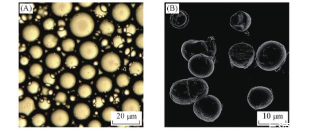 以DA-GQD為顆粒乳化劑、L-薄荷醇(熱熔)為油相制備的Pickering乳液的光學(xué)顯微鏡照片(OM)如圖5(A)所示。從圖5(A)可以看出,Pickering乳滴粒徑約為10μm,具有規(guī)則統(tǒng)一的球形形貌。由于DA-GQD具有較高的親水性,因此傾向于形成穩(wěn)定的水包油型乳液。DA-GQD固體顆粒分散在薄荷醇/水界面,這是因為液-液界面的一部分被液-顆粒界面代替時總界面能降低,L-薄荷醇被微小的石墨烯片覆蓋,位于液滴的中心。
