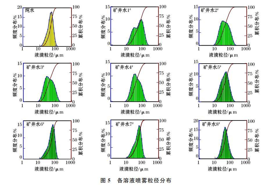 由圖4可知,純水、礦井水1#至4#、礦井水5#至8#表面張力平均值分別為57.73 mN/m、74.41 mN/m、66.03mN/m,純水表面張力明顯小于礦井水,隨著礦井水中Na+、K+數(shù)目減少,其表面張力顯著減弱。這是由于礦井水中Na+、K+離子濃度減小,靜電力吸附有效范圍擴(kuò)大,吸附作用隨之增強(qiáng),直至界面對(duì)離子的吸附作用逐漸大于排斥作用,因此表面張力呈現(xiàn)減小趨勢(shì)。由此可知,低離子濃度條件下,礦井水表面張力與其N(xiāo)a+、K+離子濃度呈正相關(guān)。在相同壓力條件下,表面張力決定霧滴粒徑分布,因此,純水噴霧霧化特性略優(yōu)于礦井水。綜上,礦井水中Na+、K+等離子濃度通過(guò)改變其表面張力間接影響噴霧霧化特性。針對(duì)煤礦井下粉塵治理,可將降塵用水進(jìn)行軟化除鹽處理后應(yīng)用于噴霧降塵,以期降低其表面張力,優(yōu)化噴霧霧化特性。
