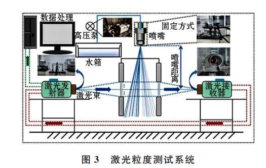 從圖3可知,噴霧粒徑測(cè)試主要儀器及工具包括激光粒度分析儀、高壓噴霧水泵、計(jì)算機(jī)分析控制系統(tǒng)等。計(jì)算機(jī)分析控制系統(tǒng)使用PAQXOS 4.1測(cè)量軟件,該軟件可定義、控制整個(gè)測(cè)量過(guò)程,并在試驗(yàn)結(jié)束后處理測(cè)量的粒度分布數(shù)據(jù)。