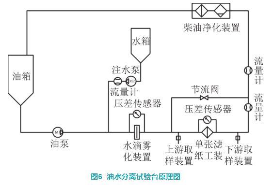 油水分離試驗臺的原理如圖6所示。通過向水滴霧化裝置上游管路內按質量比0.15%的比例注水,油水混合物通過孔板裝置后柴油中的水會破散成更小的水滴,通過控制水滴霧化裝置兩端的壓差可以得到不同粒徑分布的水滴,調節壓差得到合適粒徑分布的水滴進行油水分離效率試驗。