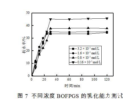 將同等體積的BOFPGS水溶液與液體石蠟混合均勻之后,在50℃恒溫中靜置觀察所形成的乳液析水情況,析水率越小說明乳化能力越強(qiáng),形成的乳液越穩(wěn)定。BOFPGS與液體石蠟形成乳液的析水率如圖7所示。從圖7可以看出,乳液隨著靜置時(shí)間增加,析水率增大,約在30 min以后乳液達(dá)到穩(wěn)定,析水率趨于平衡。BOFPGS濃度越大乳液越穩(wěn)定,析水率越低,BOFPGS濃度為0.8×10-3、1.6×10-3和3.2×10-3 mol/L的乳化性能接近,相較于KANG等人合成的短氟鏈陰離子表面活性劑(在表面活性劑質(zhì)量分?jǐn)?shù)為1%的水溶液中才能表現(xiàn)出穩(wěn)定的乳化性能),BOFPGS的用量更低,具有更好的乳化性能,可大大降低BOFPGS的使用成本。