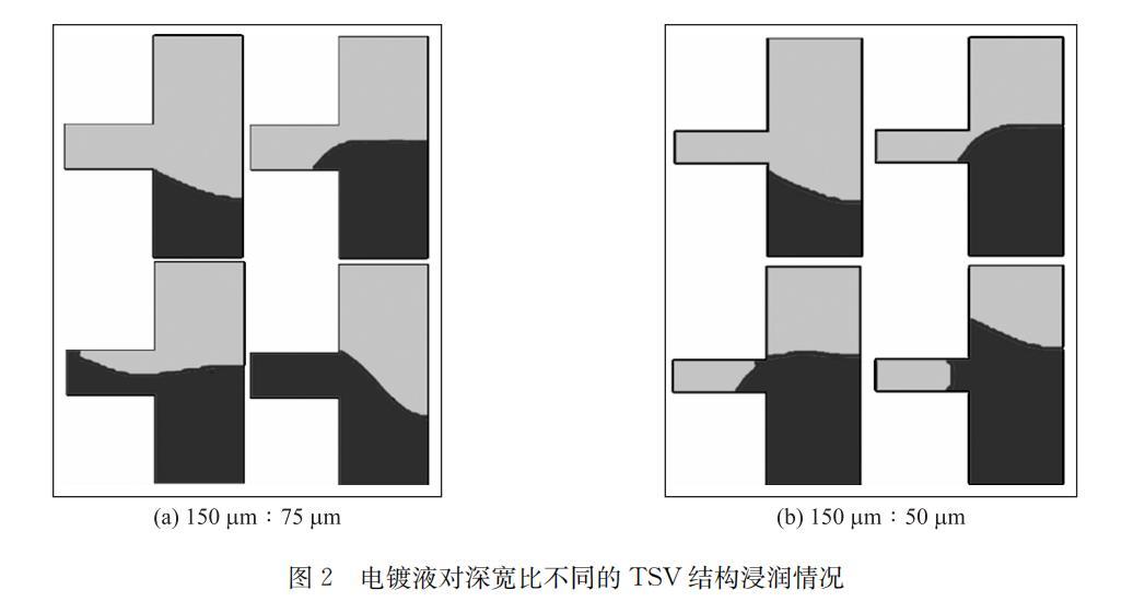 深寬比為150μm:75μm和150μm:50μm的TSV浸潤仿真結果分別如圖2的(a)(b)所示,前者可以完全浸潤,后者在TSV底部形成氣泡。模擬結果表明如果不進行充分潤濕,深寬比大于2:1的TSV就會因不能完整浸潤而在靠近TSV底部的位置形成部分表面緊貼TSV側壁的大氣泡,且該氣泡在之后的電鍍過程中難以排出,導致電鍍液無法接觸到TSV底部附近的位置,進而形成較大空洞。