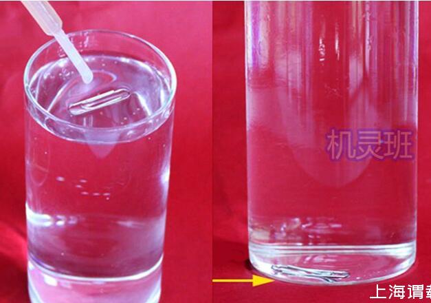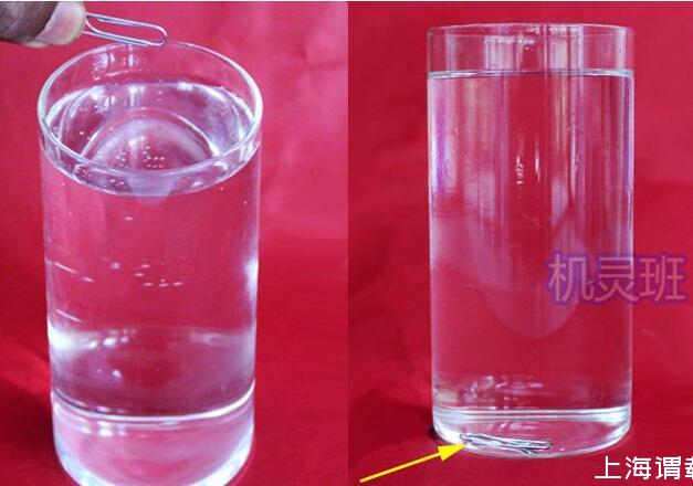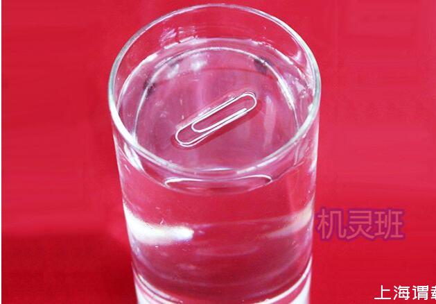 1、將回形針放入一杯水中,回形針會下沉至玻璃杯的底部!