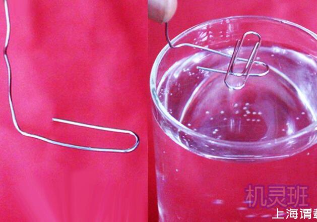 3、現(xiàn)在,將步驟2的整體回形針水平地慢慢地貼近水面,再輕輕抽走作為支架的回形針,則你會發(fā)現(xiàn)回形針漂浮在水面上。