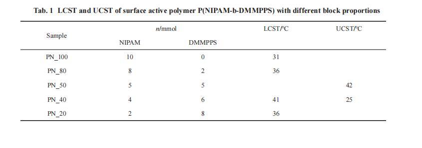 由圖中聚合物溶液透光率的變化可以得到不同嵌段比例的P(NIPAM-b-DMMPPS)的UCST和LCST,結果匯于Tab.1中。