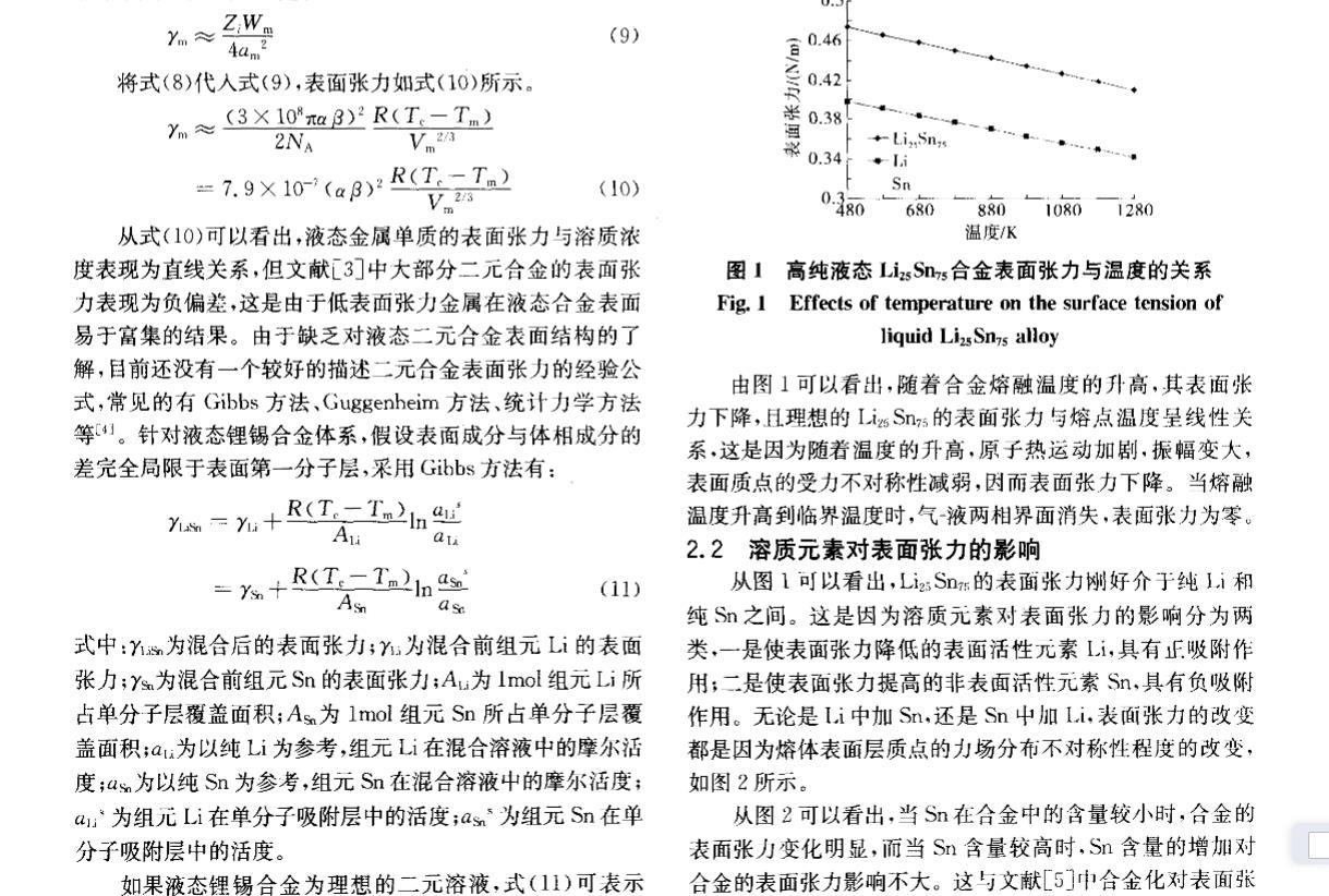 由圖l可以看出,隨著合金熔融溫度的升高,其表面張力下降,且理想的Li Sn;的表面張力與熔點溫度呈線性關(guān)系,這是因為隨著溫度的升高,原子熱運動加劇,振幅變大,表面質(zhì)點的受力不對稱性減弱,因而表面張力下降。當(dāng)熔融溫度升高到臨界溫度時,氣一液兩相界面消失,表面張力為零。