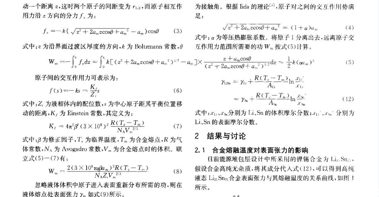 核能是公認(rèn)現(xiàn)實可行的、可大規(guī)模替代常規(guī)能源的清潔能源。聚變堆或聚變_裂變混合堆液態(tài)金屬包層因其固有特性和優(yōu)勢,在國際上被普遍認(rèn)為是未來電站最具發(fā)展?jié)摿Φ陌鼘釉O(shè)計方案之一。作為包層氚增殖劑和冷卻劑的鋰錫合金與鋰鉛合金一樣,具有廣闊的發(fā)展前景,其制備、純化、質(zhì)量輸運等工藝難題正逐步得到重視。液態(tài)金屬的表面張力不僅是認(rèn)識和理解冶煉過程最基本的物理量之一,而且是氣體吸收、氣泡形核、雜質(zhì)生長等界面現(xiàn)象的控制因素。目前對液態(tài)金屬表面張力的研究多集中于金屬單質(zhì),合金的表面或界面行為在理論或?qū)嶒炆隙枷喈?dāng)不足,主要是由于精確確定表面張力十分困難[2]。針對液態(tài)鋰錫合金這種新型的核材料,從基礎(chǔ)研究方面看,目前還沒有一種實驗方法能確定液體界面的結(jié)構(gòu),即兩個相之間過渡區(qū)域的結(jié)構(gòu),因此需要有一些假設(shè)或模型來滿足表面張力理論的研究。