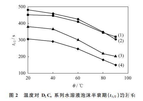 圖2 溫度對D2C系列水溶液泡沫半衰期(t1/2)的影響