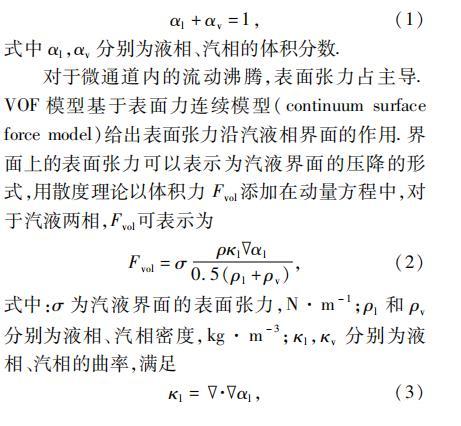 對于微通道內的流動沸騰,表面張力占主導。VOF模型基于表面力連續模型(continuum surface force model)給出表面張力沿汽液相界面的作用。界面上的表面張力可以表示為汽液界面的壓降的形式,用散度理論以體積力Fvol添加在動量方程中,對于汽液兩相,Fvol可表示為