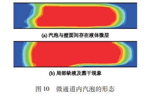 圖10a中汽泡與加熱壁面間存在一定厚度的液體微層,由壁面導出的熱量使微層內的液體迅速汽化,吸收汽化潛熱,實現熱質的快速遷移。因此,壁面不會出現局部異常過熱(圖9d中III處);圖10b則不同,汽泡與壁面間的液體微層不連續,局部出現缺液,發生干涸,汽相充斥于壁面附近,近壁區傳熱熱阻顯著增加,導致壁面熱量難以轉移,壁溫迅速升高,以局部干涸點處的壁溫為溫度最高點,向鄰近區域發生熱量擴散,形成圖9d中I,II處的溫度梯度。比較發現:相對于σ為0.059 N·m?1,σ為0.035 N·m?1時微通道內的局部異常過熱區域減少約3/4,最高過熱溫差ΔT降低約600 K,換熱更可靠、安全。