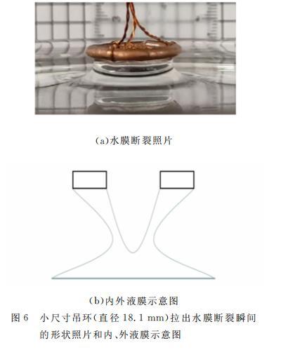 另一方面,對(duì)于尺寸較小的吊環(huán),如圖6所示,水膜的內(nèi)表面將連接在一起,只有外表面的表面張力起作用,但在計(jì)算公式中,仍以2πd?代入式(5)中,所以表面張力系數(shù)的計(jì)算值偏小。標(biāo)準(zhǔn)環(huán)的尺寸適中,環(huán)壁很薄,所以圖1(c)與圖1(d)水膜形狀近似相同,實(shí)際測(cè)量的F等于U斷前,因此計(jì)算得到的α2誤差很小??梢?,選用水膜斷裂點(diǎn)計(jì)算的表面張力系數(shù)的影響因素很多,實(shí)際斷裂點(diǎn)的瞬間位置、吊環(huán)尺寸、吊環(huán)厚薄等都是需要考慮的因素。