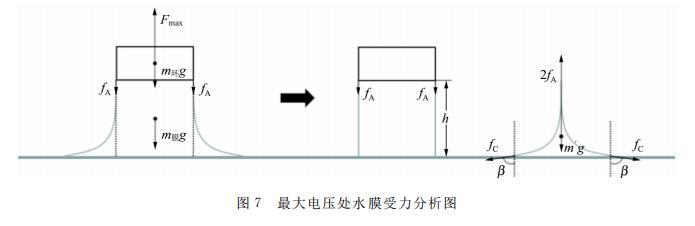 采用隔離法,對(duì)電壓最大值處的水膜進(jìn)行受力分析。圖7中虛線將水膜分成2部分,吊環(huán)正下方的水膜由于水分子相互吸引力附加在拉力Fmax中,而另一部分水膜的重力m′g,與2fA以及水膜與液面處的表面張力2fCcosβ,三者形成平衡狀態(tài),即受力分析與水膜斷裂時(shí)[圖1(d)]m2的受力相似。所以計(jì)算水膜的重力僅僅需要考慮吊環(huán)正下方的重力即可。另外,電壓最大值處的水膜穩(wěn)定性最好,拉升高度h容易測(cè)量。對(duì)于尺寸較小的吊環(huán)(πd?=78.2 mm),電壓最大值處,水膜的內(nèi)表面沒有連接在一起,仍然與液體表面接觸良好,所以測(cè)量的誤差也較?。‥α1=3.9%)。但是對(duì)于特別小的吊環(huán)(πd?=57.4 mm),水膜的內(nèi)表面連接在一起,其表面張力系數(shù)明顯偏小。