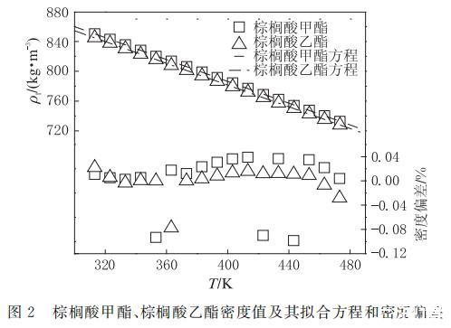 圖2 棕櫚酸甲酯、棕櫚酸乙酯的密度及其與方程(2)計算值的偏差