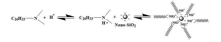 首先,在燒杯中加入1.0 g的Nano-SiO2,加入去離子水至100 g,搖晃混合1 min,超聲(200 W)分散1 h,使Nano-SiO2均勻分散在去離子水中,制得Nano-SiO2質量分數為1%的分散液,平均分成兩份各50 g。然后,在另一燒杯中加入2.0 g的C16A,加去離子水至100 g,搖晃混合溶解,得到100 g的C16A質量分數為2%的水溶液,平均分成兩份各50 g,其中一份使用質量分數為3.6%的鹽酸調節其pH=4.5,另一份不處理(pH為7.5)。將兩份C16A水溶液(pH=4.5、7.5)分別與Nano-SiO2分散液混合,放置30 min至平衡穩定,制成C16A-SiO2降黏劑溶液。最后,將兩份C16A-SiO2降黏劑溶液離心,用去離子水洗2次、乙醇洗2次,在60℃烘箱中烘干24 h,即得pH響應型稠油降黏劑(C16A-SiO2),分別記為 C16A-SiO2 (pH4.5)、 C16A-SiO2 (pH7.5)。