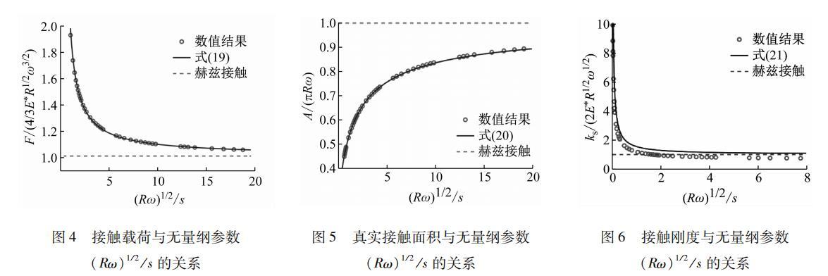 實際工程中不同粗糙表面對應的微凸體曲率半徑各不相同,在上述的數值求解過程中,以微凸體曲率半徑R=10 mm為例來研究表面張力對接觸特性的影響,其他參數G=1 MPa, μ=0.4, β=0.1 J/m2。獲得了無量綱接觸載荷F/(4/3 E* R1/2 ω3/2)和無量綱接觸面積A/πRω與無量綱參數(Rω)1/2/s的數值關系,通過對數值解的擬合,得到了考慮表面張力時載荷F和真實接觸面積A與壓入深度ω的關系式分別如式(19)和式(20)所示,且不同的R值只會影響式(19)和式(20)中的擬合系數。