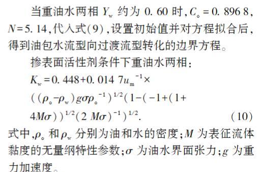 當重油水兩相 Y w 約為0.60時,C o=0.896 8, N=5.14,代入式(9),設置初始值并對方程擬合后, 得到油包水流型向過渡流型轉化的邊界方程。