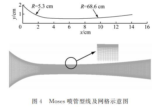 為了分析蒸汽進(jìn)口參數(shù)對(duì)表面張力修正系數(shù)最佳取值的影響,筆者基于 Moses 等的對(duì)稱噴管開展研究。實(shí)驗(yàn)噴管型線及網(wǎng)格見圖 4,亞音速區(qū)是半徑為 5.3 cm 的圓弧,跨音速區(qū)是半徑為 68.6 cm 的圓弧,噴管喉部位于 x=6.22 cm 處。數(shù)值模擬采用的網(wǎng)格為結(jié)構(gòu)化網(wǎng)格,對(duì)壁面及喉部處的網(wǎng)格進(jìn)行加密。噴管壁面最大 y+ 小于 5,網(wǎng)格質(zhì)量在 0.7 以上。噴管網(wǎng)格數(shù)量為 28 萬。