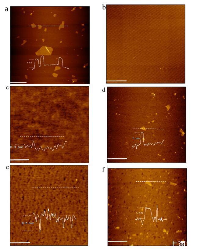 圖 5. 新鮮切割的云母表面上的 AFM 圖像(比例尺 = 1 μm):(a)干燥后的一滴 GO 分散體; (b) LB的對(duì)照實(shí)驗(yàn) 在空氣-GO 水界面沒(méi)有脂質(zhì)沉積的薄膜; (c) 從空氣-純水界面轉(zhuǎn)移的 DODAB LB 薄膜; (d) LB膜 從空氣-GO水界面轉(zhuǎn)移的DODAB; (e) 從空氣-純水界面轉(zhuǎn)移的 DSEPC LB 薄膜; (f) LB膜 DSEPC 從空氣-GO 水界面轉(zhuǎn)移。 所有脂質(zhì) LB 膜都在 20 mN/m 的恒定表面壓力下轉(zhuǎn)移。