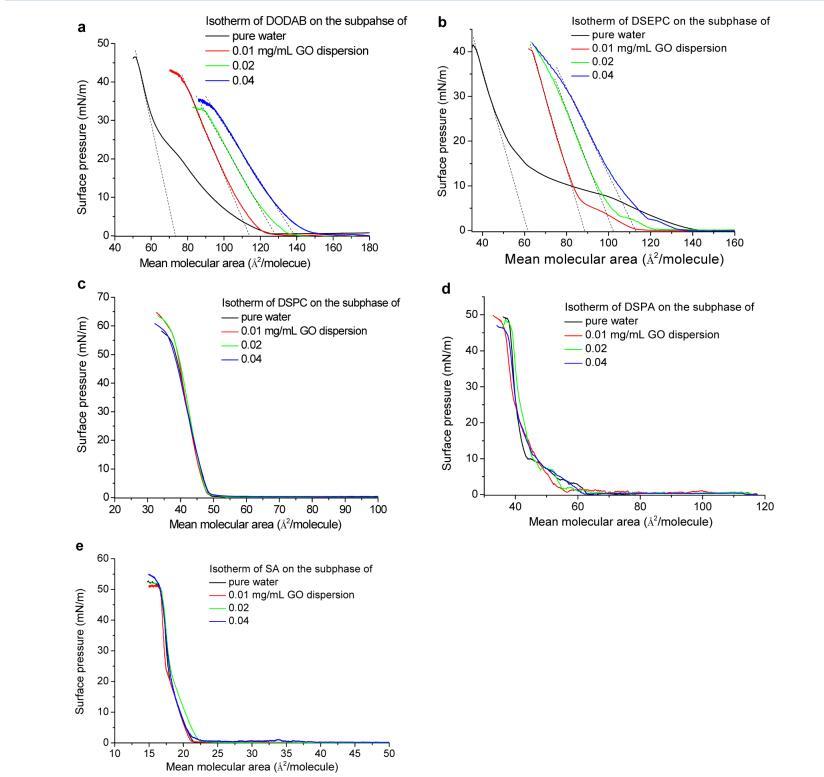 圖 1. 空氣-水或 GO 分散界面處脂質(zhì)的表面壓力-面積等溫線:(a) 帶正電荷的 DODAB; (b) 積極 收費(fèi) DSEPC; (c) 帶中性電荷的 DSPC; (d) 帶負(fù)電的 DSPA; (e) 帶負(fù)電的 SA。 請(qǐng)注意,沒(méi)有表面壓力 在空氣-GO 分散界面處檢測(cè)到,而沒(méi)有在界面處擴(kuò)散脂質(zhì)。 每個(gè)分子軸面積的虛線的截距 表示每個(gè)分子的極限面積。