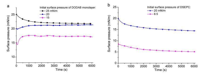 圖 4. GO 在不同表面的 (a) DODAB 和 (b) DSEPC 單層的吸附研究(表面壓力與經(jīng)過(guò)時(shí)間) 壓力。 單層首先在純水亞相上壓縮到一定的表面壓力,然后 600 μL 1 mg/mL GO 分散體 被小心地緩慢注入單層下方的水亞相中。