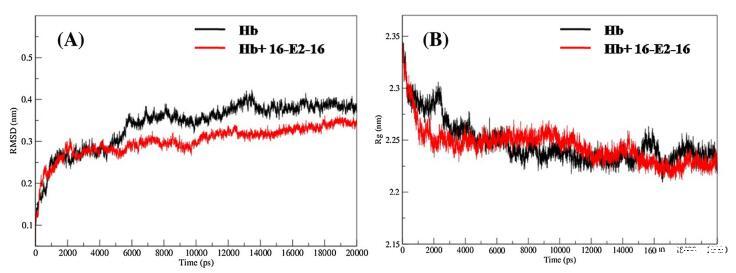 進(jìn)一步研究16-E2-16的結(jié)構(gòu)穩(wěn)定性影響 結(jié)合Hb,采用分子動(dòng)力學(xué)模擬。 我們分析了兩者的動(dòng)態(tài)結(jié)構(gòu)特性,例如均方根偏差 (RMSD) 和回轉(zhuǎn)半徑 (Rg)。 未綁定和 16-E2-16 有界 Hb 使用從獲得的軌跡 MD模擬。