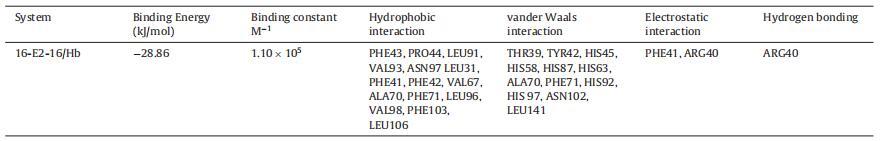Hb 中的 α 和 β 鏈具有相似的結(jié)構(gòu)折疊, 由七個(gè)連續(xù)的α-螺旋和兩條鏈組成 包含由螺旋 4 和 5 包圍的間隙結(jié)合袋,而空腔的底部由 C 端部分形成 螺旋 6 和螺旋 7 的 N 端片段 [69]。 16-E2-16為主 Hb 與中央空腔、α1 和 β2 鏈結(jié)合(圖 6A)。 這 該結(jié)合位點(diǎn)上的氨基酸殘基包括 Thr39, α1 中的 Tyr42、Phe43、Pro44、His45、His58、His87、Leu91、Val93、Asn97 鏈和 Leu31、Arg40、Phe41、Phe42、His63、Val67、Ala70、Phe71、 His92, Leu96, His 97, Val98, Asn102, Phe103, Leu106, Leu141 in β2 鏈圖 6B。 有超過(guò) 20 個(gè)氨基酸殘基位于 16-E2-16 的站點(diǎn),這意味著它們之間的強(qiáng)相互作用 16-E2-16 和 Hb [70]。 疏水性和靜電力作用 在 16-E2-16 與 Hb 的結(jié)合中起重要作用,這個(gè)結(jié)果是 與我們的實(shí)驗(yàn)結(jié)果一致。 然而,范德瓦爾斯 力量不容忽視。 已觀察到一個(gè)氫鍵 在 16-E2-16/Hb 相互作用中的 16-E2-O 原子 具有 β2 鏈 ARG40 的 16 個(gè)分子(圖 6C)。 的形成 氫鍵穩(wěn)定 16-E2-16/Hb 復(fù)合物。 的類(lèi)型 相互作用和參與相互作用的氨基酸殘基 以表格形式顯示(表 3)。
