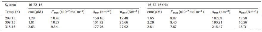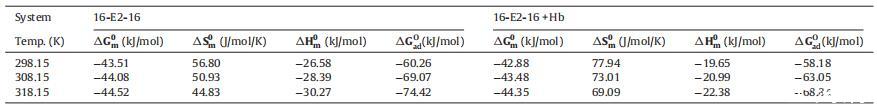 表 2 膠束化的自由能 (αG0m)、熵 (αS0m) 和焓 (αH0m) 的變化以及自由能 (αG0) 的變化 ad) 不存在和存在時(shí) 16-E2-16 的吸附 不同溫度下的 Hb。