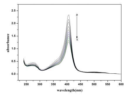 圖 2. 不存在和存在 16-E2-16 時(shí) Hb (5 μM) 的紫外-可見(jiàn)光譜。 這 16-E2-16 (am) 的濃度為 0, 0.39, 0.76, 1.13, 1.48, 1.81, 2.14, 2.45, 2.75, 3.05 和 3.33 μM。