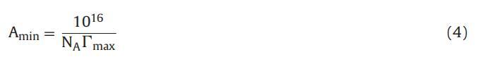 其中 γ 是表面活性劑濃度 C 下的平衡表面張力 (mNm?1),n 是每分子的粒子數(shù) 表面活性劑。 由于表面活性劑的解離導(dǎo)致三種物質(zhì)的形成,公式 1111 表示在低于 cmc 的恒定溫度下 γ 與 log[16-E2-16] 之間的曲線(xiàn)斜率。 ∫max 值允許計(jì)算 每個(gè)分子 Amin 的最小表面積(以 nm2 為單位) 方程: