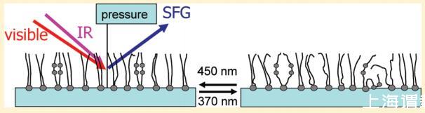 在此,我們研究了光開關(guān)脂質(zhì)DT Azo-5P(圖1)的單層,其為純的,并與脂質(zhì)1,2-二棕櫚酰-sn-甘油-3-磷酸膽堿(DPPC)混合。如圖1中的UV/vis光譜所示,光活性脂質(zhì)可分別用370和450 nm的光從其反式狀態(tài)切換到順式狀態(tài)并返回。我們將表面壓力測量與無標簽、寬帶振動和頻率產(chǎn)生(VSFG)光譜相結(jié)合。10這些技術(shù)使我們能夠研究空氣-水界面上的脂質(zhì)分子單層。可以獲得有關(guān)脂質(zhì)與水分子相互作用的信息以及脂質(zhì)的分子結(jié)構(gòu)。在非線性光學(xué)技術(shù)VSFG中,紅外(IR)光束和可見光(VIS)光束在界面處組合,產(chǎn)生具有兩個入射光束和頻率的信號。如果紅外線與分子振動共振,信號就會強烈增強。已經(jīng)證明,這種通過分子振動的技術(shù)提供了有關(guān)脂質(zhì)分子構(gòu)象和取向的信息。11-18在中心對稱介質(zhì)中禁止和頻產(chǎn)生,因為這是一種二階非線性光學(xué)過程。19因此,該技術(shù)對中心對稱材料(如水表面)的最外表面分子層敏感。相反,缺少信號表明界面上的材料或分子群是中心對稱的。對于金表面偶氮苯功能化自組裝單分子膜,SFG在測定光異構(gòu)化的截面和機理方面非常有用。得出的結(jié)論是,光異構(gòu)化是由直接電子激發(fā)驅(qū)動的,類似于液相中的偶氮苯