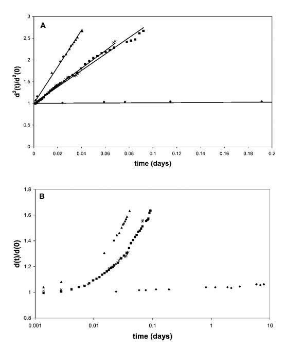 圖1面板A顯示了黃原膠溶液中50 vol%氣泡的相對平方氣泡直徑d2(t)/d2(0)。 泡沫由含有0.1 wt%HFBII(A)、0.5 wt%b-lg(-)、0.1 wt%b-酪蛋白(:)和0.1 wt%Quillaja皂甙(*)的水溶液生成。 將所得泡沫轉(zhuǎn)移到0.5 wt%黃原膠溶液中。 面板B以對數(shù)時(shí)間刻度顯示整個(gè)時(shí)間間隔內(nèi)的數(shù)據(jù)。