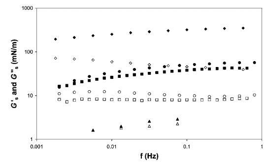 表面剪切流變學(xué)。 所有四個(gè)系統(tǒng)的表面剪切流變測量如圖11所示。 我們觀察到HFBII具有模量,比b-乳球蛋白和皂甙高一個(gè)數(shù)量級,這與早期結(jié)果一致。25值得一提的是,對于像奎拉葉皂甙這樣的表面活性劑,測得的表面剪切彈性非常高。 b-酪蛋白的表面剪切模量要低一個(gè)數(shù)量級。 關(guān)于頻率,我們發(fā)現(xiàn)與HFBII相比,皂甙和b-乳球蛋白對頻率的依賴性更強(qiáng),尤其是在低頻率下。 此外,對于HFBII而言,Gs 00/Gs0的比率是最低的,即表面彈性對模量的貢獻(xiàn)比表面粘度大得多。 當(dāng)我們向交叉點(diǎn)外推時(shí),我們預(yù)計(jì)HFBII和b-乳球蛋白或皂甙之間的弛豫時(shí)間會有一個(gè)數(shù)量級的差異。 對于b-酪蛋白,從0.01 Hz左右的數(shù)據(jù)可以很容易地觀察到交叉點(diǎn)。