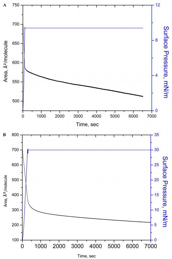 圖3.在亞相pH值5.6下,在表面壓力為10(A)和30 mN/m(B)的條件下,對(duì)人胰島素Langmuir單層膜進(jìn)行90 min的穩(wěn)定性測量。