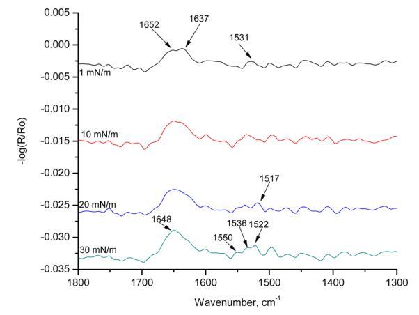 圖7顯示了HI-Langmuir單層在不同表面壓力下60°時(shí)的p極化。 這條帶子在1517厘米處 ? 1對(duì)應(yīng)于α-螺旋。 在1 mN/m的表面壓力下,有兩個(gè)可見帶:1652和1637 cm ? 1. 隨著表面壓力的增加,這兩個(gè)譜帶重疊并成為一個(gè)寬帶。 在30百萬米 ? 1,波段可視為單個(gè)波段,頻率為1648厘米 ? 1. 這是對(duì)應(yīng)于α-螺旋的酰胺II區(qū)域的條帶。 下一個(gè)波段在1531厘米處以1 mN/m的寬帶出現(xiàn) ? 1. 隨著表面壓力的增加,它分成三個(gè)帶:1550、1536和1522厘米 ? 1. 在1550和1522厘米處的頻帶 ? 1分別對(duì)應(yīng)于α-螺旋和β-折疊中的酰胺II區(qū)域。 這種譜帶分裂表明,譜帶位于1531厘米處 ? 在較低的表面壓力下,1由α-螺旋和β-片組成。 在較高的表面壓力下,譜帶分離為離散的單個(gè)峰。 光譜中出現(xiàn)的其他峰是由于氨基酸和烷烴鏈的存在。 這條帶子長1448厘米 ? 1對(duì)應(yīng)于C ? H CH2和CH3的剪切。 HI-Langmuir單分子膜的p-極化輻照度中存在所有三個(gè)表明α-螺旋的主譜帶。