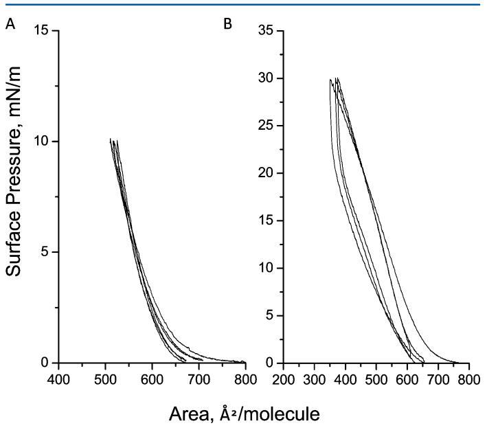 圖2.三個(gè)壓縮 ? 在亞相pH值5.6下,減壓循環(huán)達(dá)到10(a)和30 mN/m(B)的人胰島素Langmuir單層表面壓力。