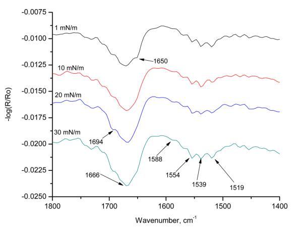 圖9顯示了在不同表面壓力下獲得的HI-Langmuir單層膜的s偏振輻照度。 在1 mN m的表面壓力下 ? 1,在1650 cm處存在一條帶 ? 1對(duì)應(yīng)于α-螺旋。 隨著表面壓力的增加,該條帶消失,并在1666 cm處并入該條帶 ? 1. 這條帶子長1666厘米 ? 1包括β-轉(zhuǎn)角和α-螺旋。 這條帶子有1694厘米長 ? 1對(duì)應(yīng)于β片。 這條帶子在1519厘米處 ? 1也對(duì)應(yīng)于α-螺旋。 在入射角為60°的情況下,在1670處觀察到的能帶可歸屬于存在于β-轉(zhuǎn)角中的空間約束C=O部分,或者由于β-薄片中的躍遷偶極耦合而注意到峰值中的分裂。 當(dāng)改變表面壓力時(shí),最強(qiáng)烈的譜帶出現(xiàn)在1554和1539厘米處 ? 1,兩條帶均對(duì)應(yīng)于酰胺II區(qū)的α-螺旋。 所有三條主譜帶都表明HI-Langmuir單層的s極化輻照度中存在α-螺旋。