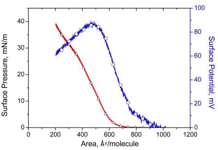 圖1。 表面壓力( △) 表面電位 ? 區(qū)域( ○) 亞相pH值5.6時(shí)人胰島素Langmuir單層的等溫線。