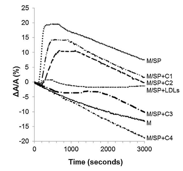 圖5。注入(…)后,由單層(M)覆蓋并在不含(-)額外分子的緩沖液上形成的界面的相對表面積隨時間的變化SP(26.6±1.5 mg蛋白質)、SP(26.6±1.5 mg蛋白質)和不同濃度(··-)C1、(·-)C2的脂質體的混合物,(·-)C3和(·-)C4(分別為1.17±0.02 mg、2.18±0.02 mg、4.37±0.02 mg和6.55±0.02 mg脂質)和(---)LDL(4.6 mg PC)和SP(26.6±1.5 mg蛋白質)的混合物。空氣-緩沖界面處的溫度為34℃。表面壓力保持在25 mN/m。